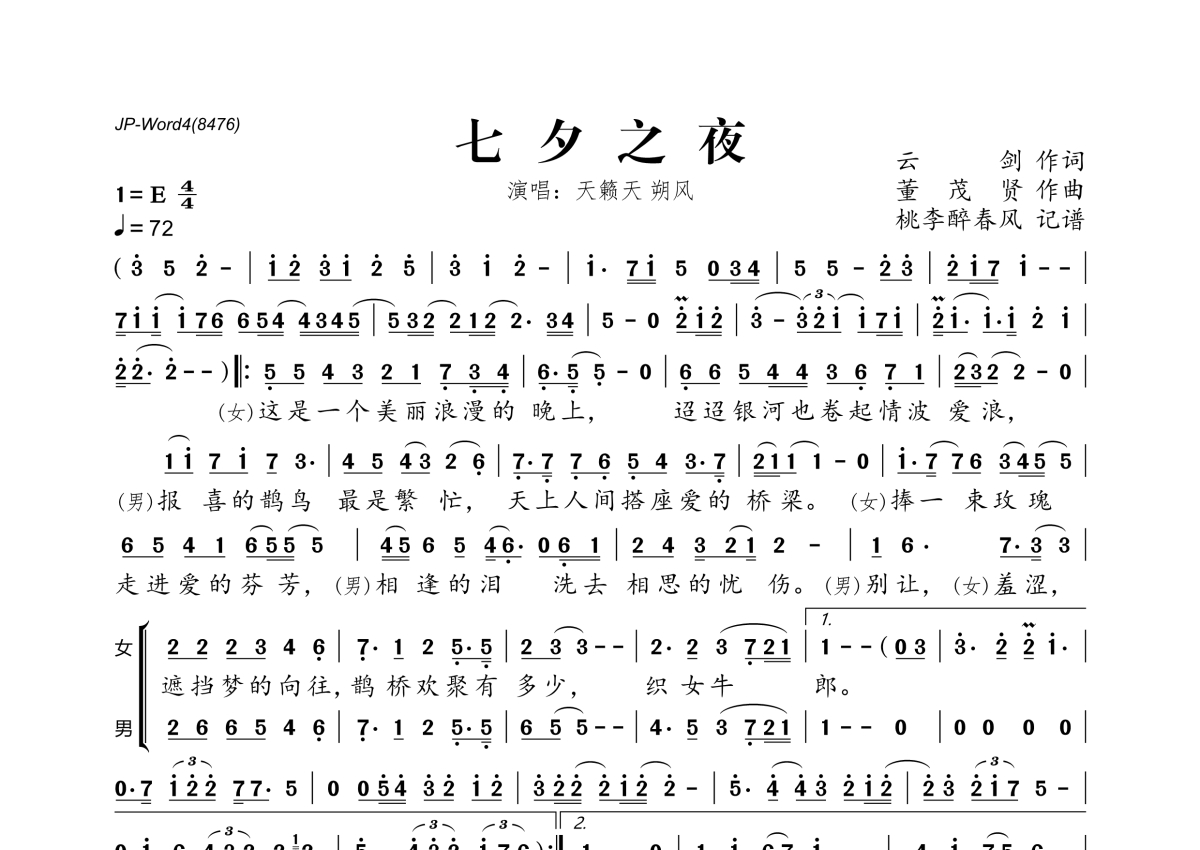 《七夕之夜》是天籁天&朔风演唱的一首歌曲,拍号为4/4拍,歌曲速度为每分钟72拍,这份简谱共有一张高清图谱,图谱由 @桃李醉春风 编配上传。