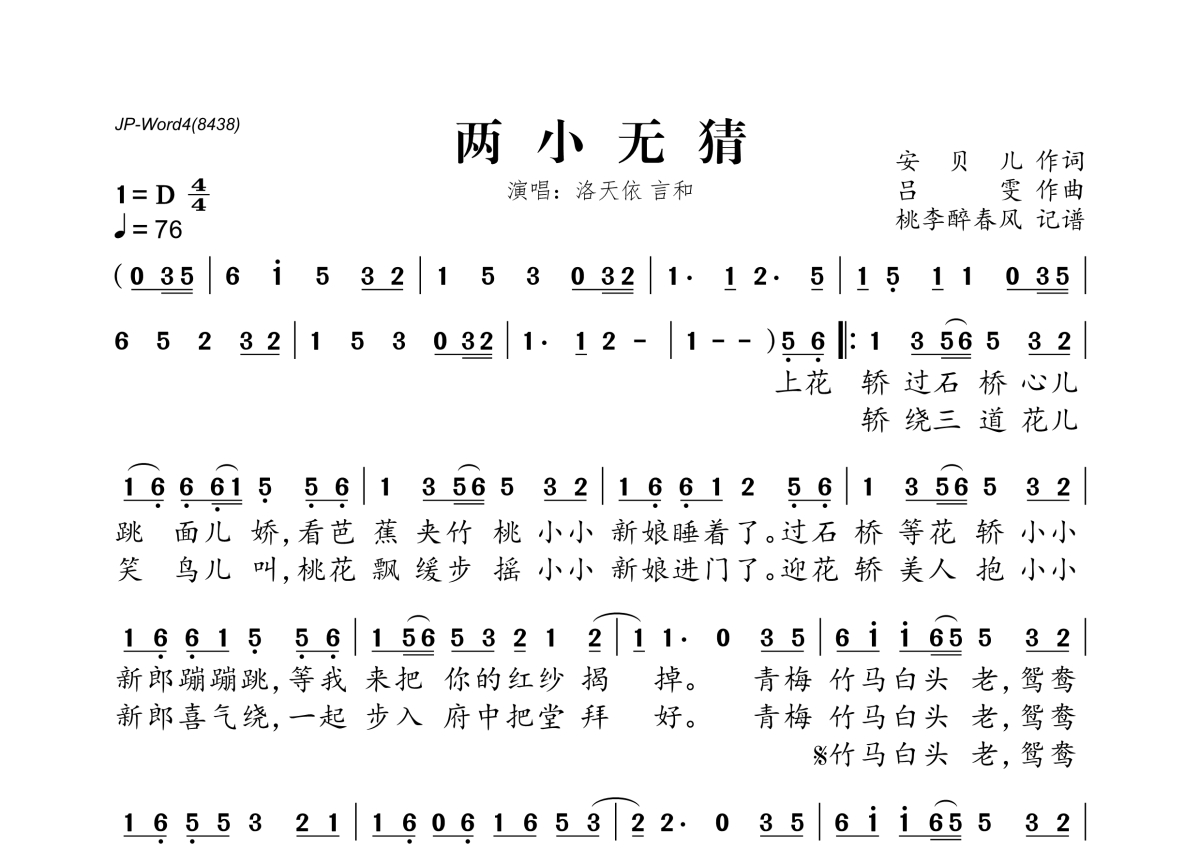 《两小无猜》是言和&洛天依演唱的一首歌曲,拍号为4/4拍,歌曲速度为每分钟76拍,这份简谱共有一张高清图谱,图谱由 @桃李醉春风 编配上传。
