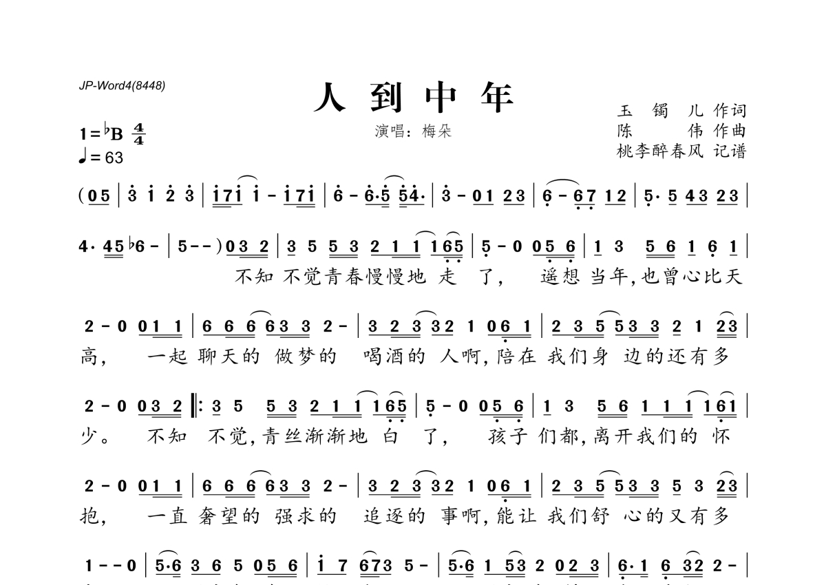 《人到中年》是梅朵演唱的一首歌曲,拍号为4/4拍,歌曲速度为每分钟63拍,这份简谱共有一张高清图谱,图谱由 @桃李醉春风 编配上传。