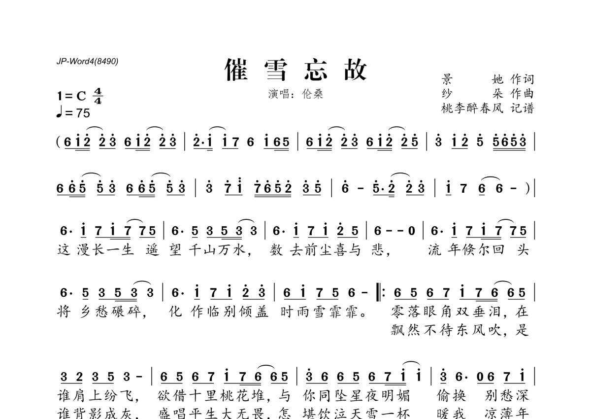 《催雪忘故》是伦桑演唱的一首歌曲,拍号为4/4拍,歌曲速度为每分钟75拍,这份简谱共有一张高清图谱,图谱由 @桃李醉春风 编配上传。