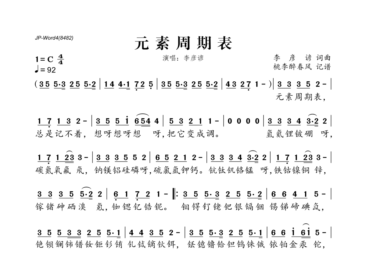 《元素周期表》是李彦谚演唱的一首歌曲,拍号为4/4拍,歌曲速度为每分钟92拍,这份简谱共有一张高清图谱,图谱由 @桃李醉春风 编配上传。