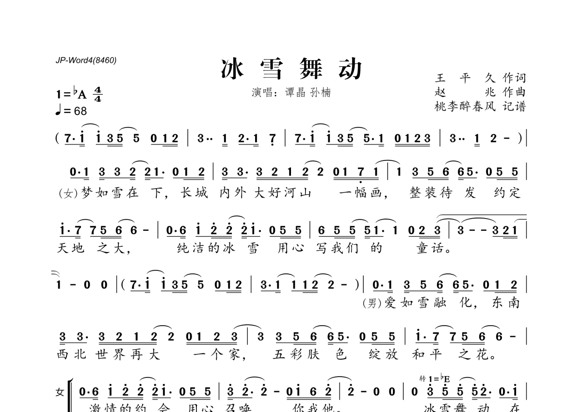 《冰雪舞动》是谭晶&孙楠演唱的一首歌曲,拍号为4/4拍,歌曲速度为每分钟68拍,这份简谱共有两张高清图谱,图谱由 @桃李醉春风 编配上传。