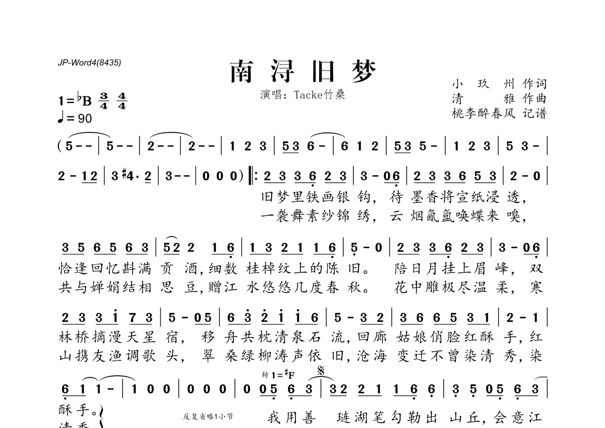 《南浔旧梦》是Tacke竹桑演唱的一首歌曲,拍号为4/4拍,歌曲速度为每分钟90拍,这份简谱共有一张高清图谱,图谱由 @桃李醉春风 编配上传。