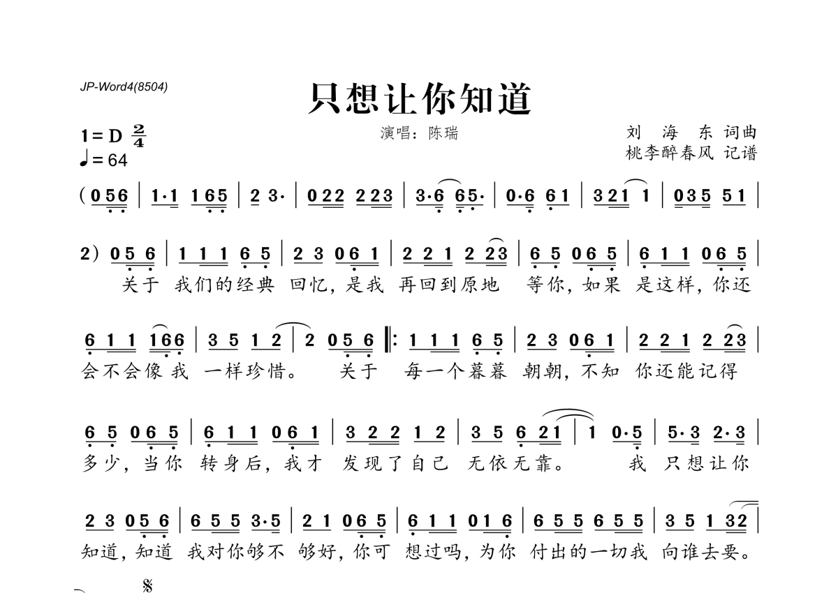 《只想让你知道》是陈瑞演唱的一首歌曲,拍号为2/4拍,歌曲速度为每分钟64拍,这份简谱共有一张高清图谱,图谱由 @桃李醉春风 编配上传。