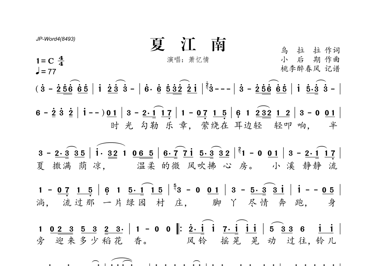 《夏江南》是萧忆情演唱的一首歌曲,拍号为4/4拍,歌曲速度为每分钟77拍,这份简谱共有一张高清图谱,图谱由 @桃李醉春风 编配上传。