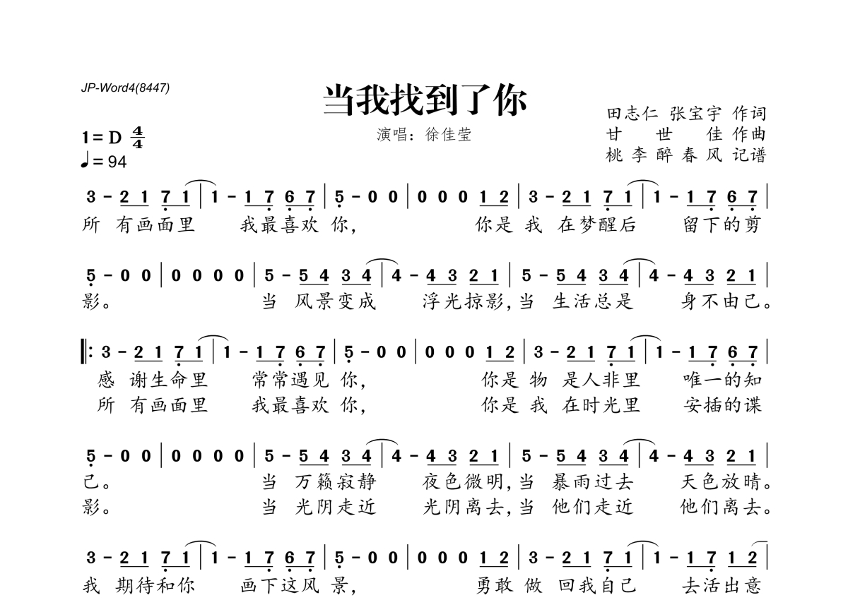 《当我找到了你》是徐佳莹演唱的一首歌曲,拍号为4/4拍,歌曲速度为每分钟94拍,这份简谱共有一张高清图谱,图谱由 @桃李醉春风 编配上传。