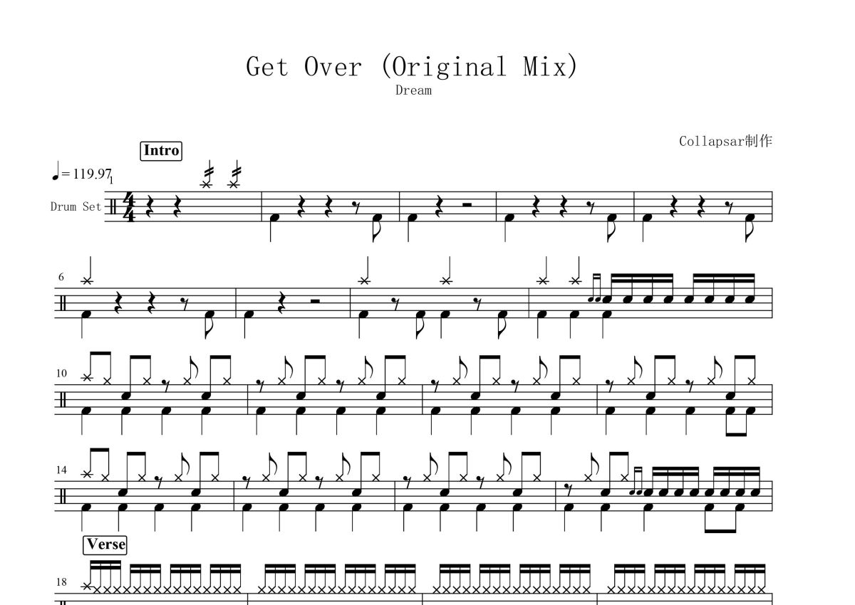 《Get over》是Dream演唱的一首歌曲,这份鼓谱共有四张高清图谱,图谱由 @打鼓谱 编配上传,图谱使用五线谱编配,使用这份Get over架子鼓谱,你将能够轻松地敲打出这首Dream的Get over,快来尝试吧。《Get over》是日本女子组合Dream演唱的歌曲,由松室麻衣作词,BOUNCEBACK作曲,收录于Dream在2002年2月14日发行的第二张原创大碟《Process》中,是日本动画《棋魂》片头曲之一。Dream,日本株式会社LDH JAPAN旗下的女子流行乐舞蹈、演唱团体。由Shizuka、Erie、Aya、Ami组成。