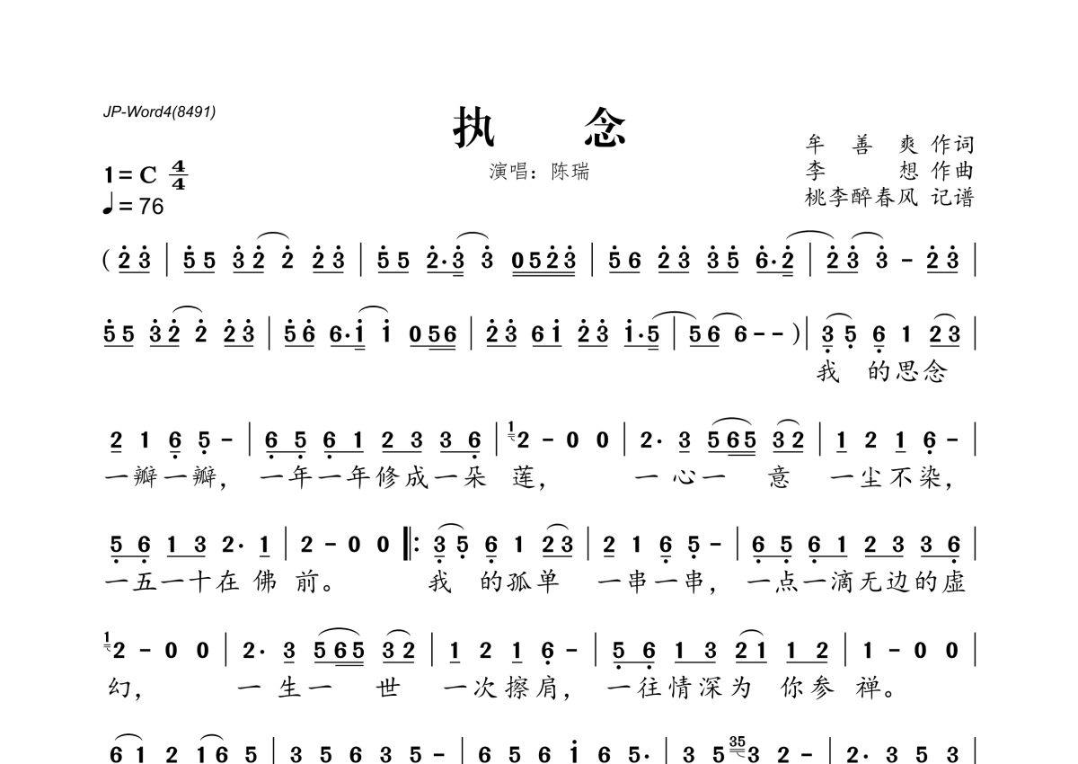 《执念》是陈瑞演唱的一首歌曲,拍号为4/4拍,歌曲速度为每分钟76拍,这份简谱共有一张高清图谱,图谱由 @桃李醉春风 编配上传。