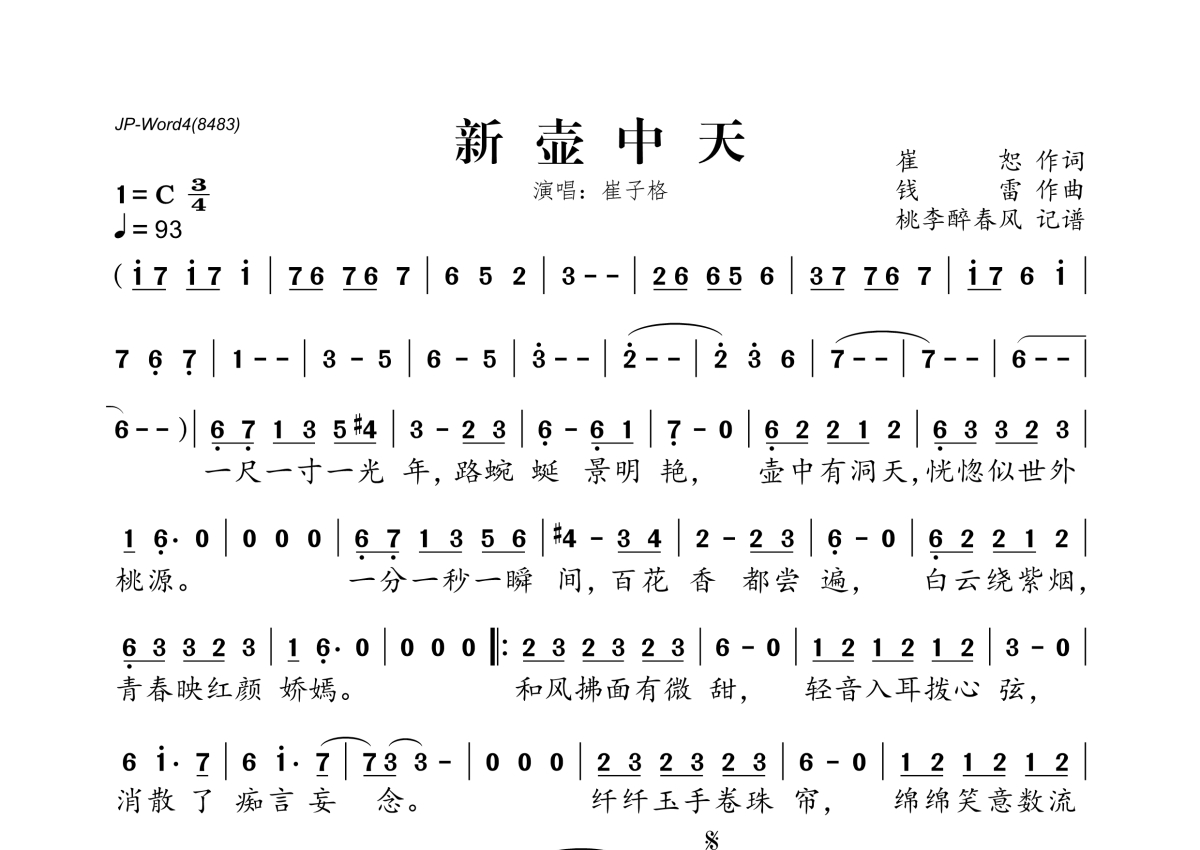 《新壶中天》是崔子格演唱的一首歌曲,拍号为3/4拍,歌曲速度为每分钟93拍,这份简谱共有一张高清图谱,图谱由 @桃李醉春风 编配上传。