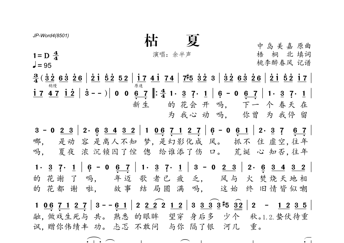 《枯夏》是余半声演唱的一首歌曲,拍号为4/4拍,歌曲速度为每分钟95拍,这份简谱共有一张高清图谱,图谱由 @桃李醉春风 编配上传。
