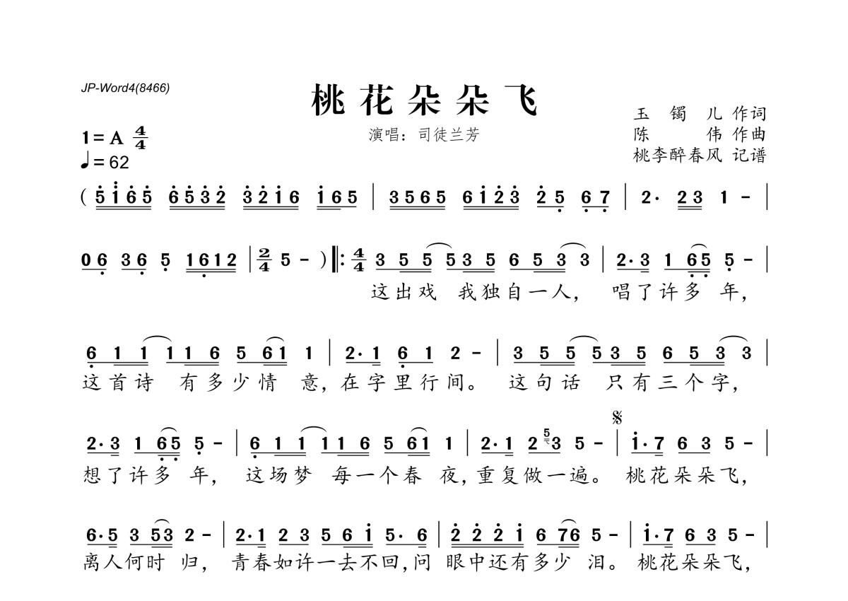 《桃花朵朵飞》是司徒兰芳演唱的一首歌曲,拍号为4/4拍,歌曲速度为每分钟62拍,这份简谱共有一张高清图谱,图谱由 @桃李醉春风 编配上传。