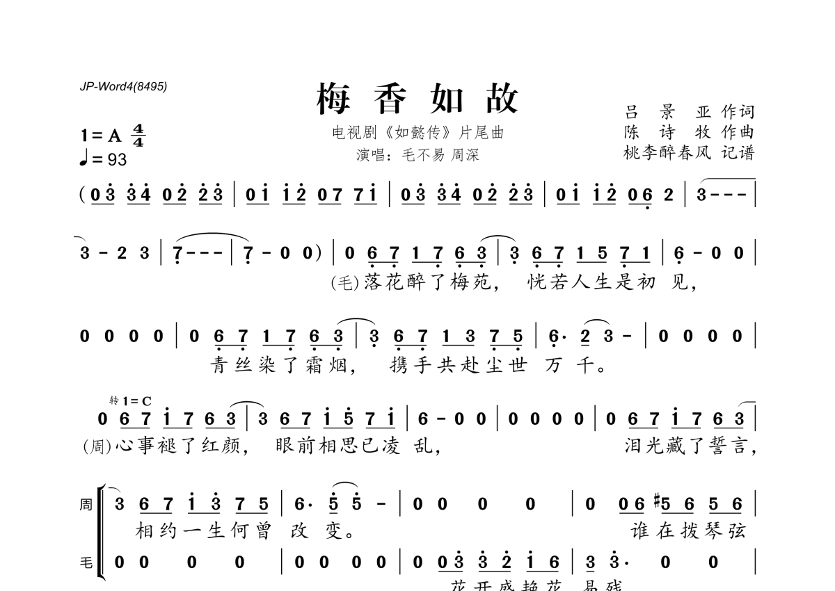 《梅香如故》是毛不易&周深演唱的一首歌曲,拍号为4/4拍,歌曲速度为每分钟93拍,这份简谱共有两张高清图谱,图谱由 @桃李醉春风 编配上传。