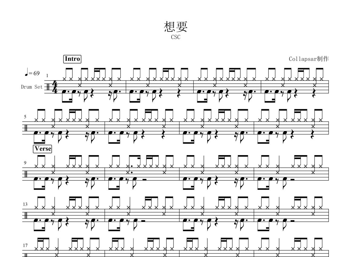 《想要》是CSC演唱的一首歌曲,这份鼓谱共有两张高清图谱,图谱由 @打鼓谱 编配上传,图谱使用五线谱编配,使用这份想要架子鼓谱,你将能够轻松地敲打出这首CSC的想要,快来尝试吧。《想要》现场版。