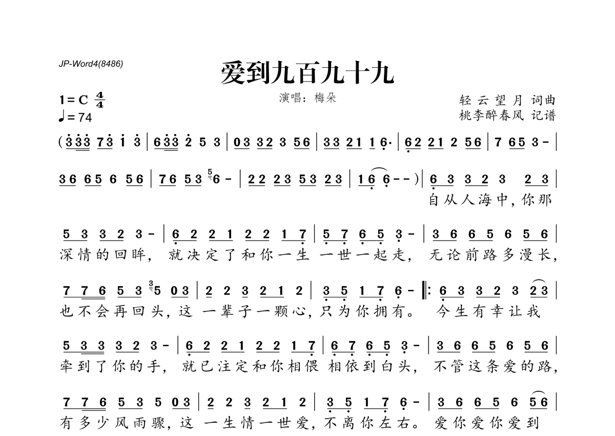 《爱到九百九十九》是梅朵演唱的一首歌曲,拍号为4/4拍,歌曲速度为每分钟74拍,这份简谱共有一张高清图谱,图谱由 @桃李醉春风 编配上传。