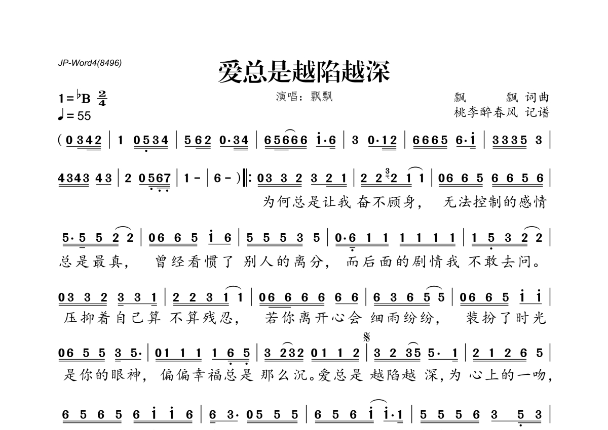 《爱总是越陷越深》是飘飘演唱的一首歌曲,拍号为2/4拍,歌曲速度为每分钟55拍,这份简谱共有一张高清图谱,图谱由 @桃李醉春风 编配上传。