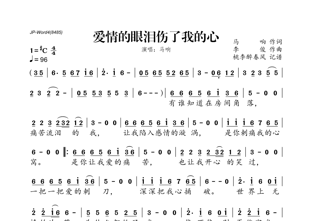 《爱情的眼泪伤了我的心》是马响演唱的一首歌曲,拍号为4/4拍,歌曲速度为每分钟96拍,这份简谱共有一张高清图谱,图谱由 @桃李醉春风 编配上传。