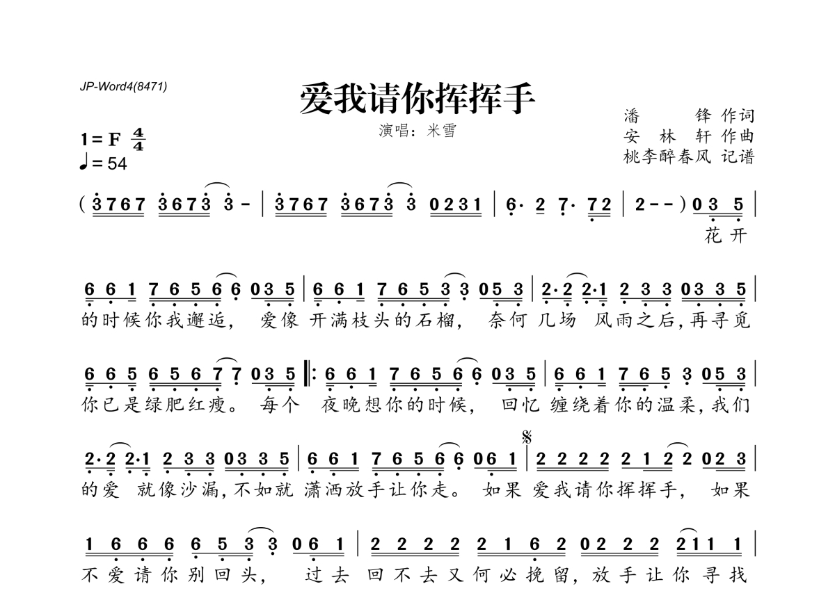 《爱我请你挥挥手》是米雪演唱的一首歌曲,拍号为4/4拍,歌曲速度为每分钟54拍,这份简谱共有一张高清图谱,图谱由 @桃李醉春风 编配上传。