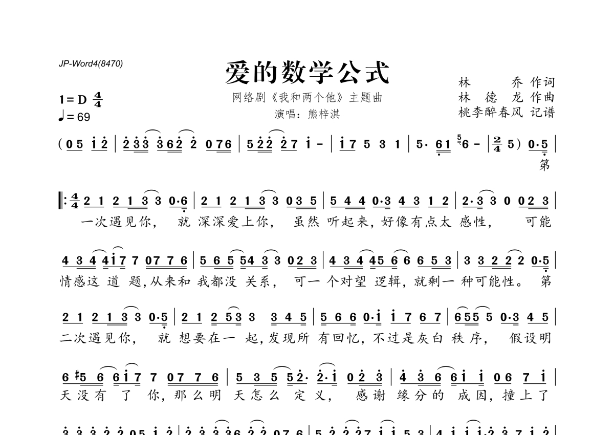 《爱的数学公式》是熊梓淇演唱的一首歌曲,拍号为4/4拍,歌曲速度为每分钟69拍,这份简谱共有一张高清图谱,图谱由 @桃李醉春风 编配上传。