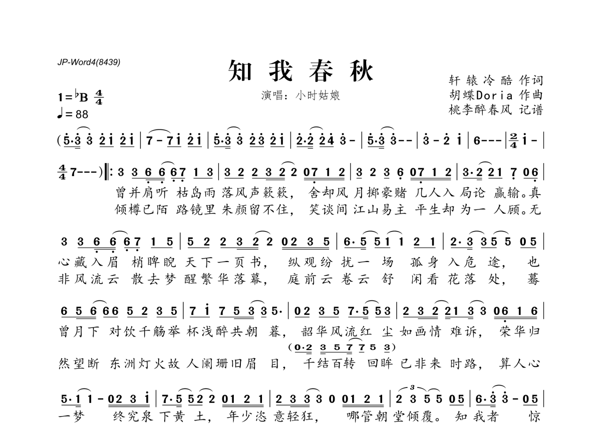 《知我春秋》是小时姑娘演唱的一首歌曲,拍号为4/4拍,歌曲速度为每分钟88拍,这份简谱共有一张高清图谱,图谱由 @桃李醉春风 编配上传。