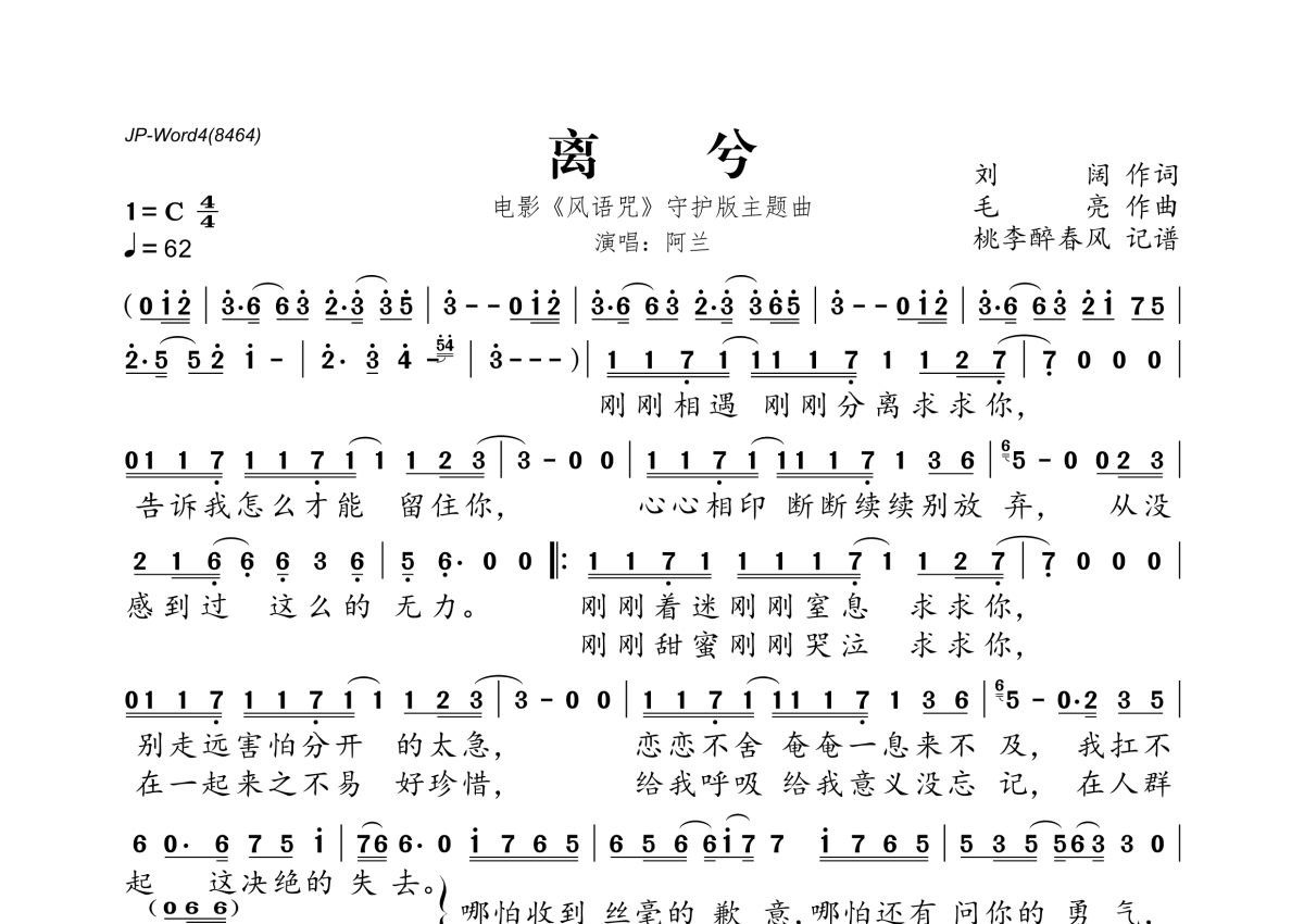 《离兮》是阿兰演唱的一首歌曲,拍号为4/4拍,歌曲速度为每分钟62拍,这份简谱共有一张高清图谱,图谱由 @桃李醉春风 编配上传。