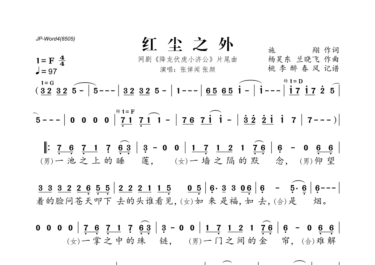 《红尘之外》是张倬闻&张颜演唱的一首歌曲,拍号为4/4拍,歌曲速度为每分钟97拍,这份简谱共有一张高清图谱,图谱由 @桃李醉春风 编配上传。