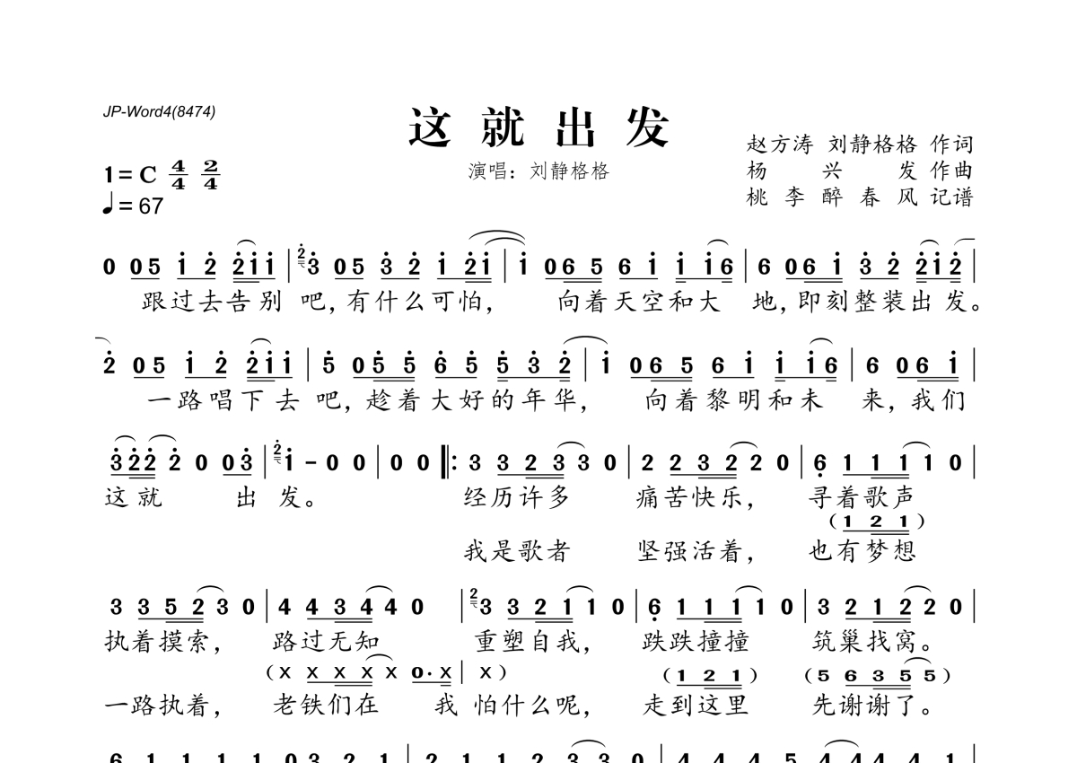 《这就出发》是刘静格格演唱的一首歌曲,拍号为4/4拍,歌曲速度为每分钟67拍,这份简谱共有一张高清图谱,图谱由 @桃李醉春风 编配上传。