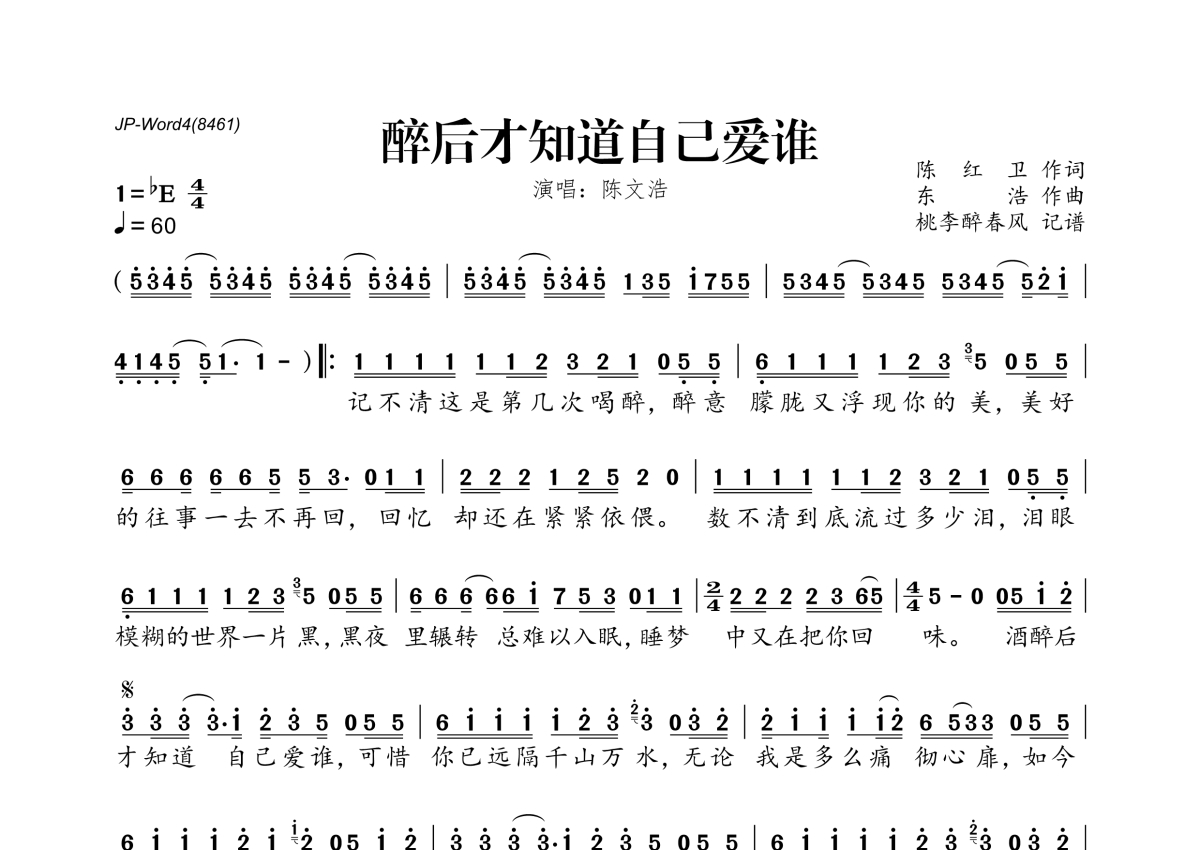 《醉后才知道自己爱谁》是陈文浩演唱的一首歌曲,拍号为4/4拍,歌曲速度为每分钟60拍,这份简谱共有一张高清图谱,图谱由 @桃李醉春风 编配上传。