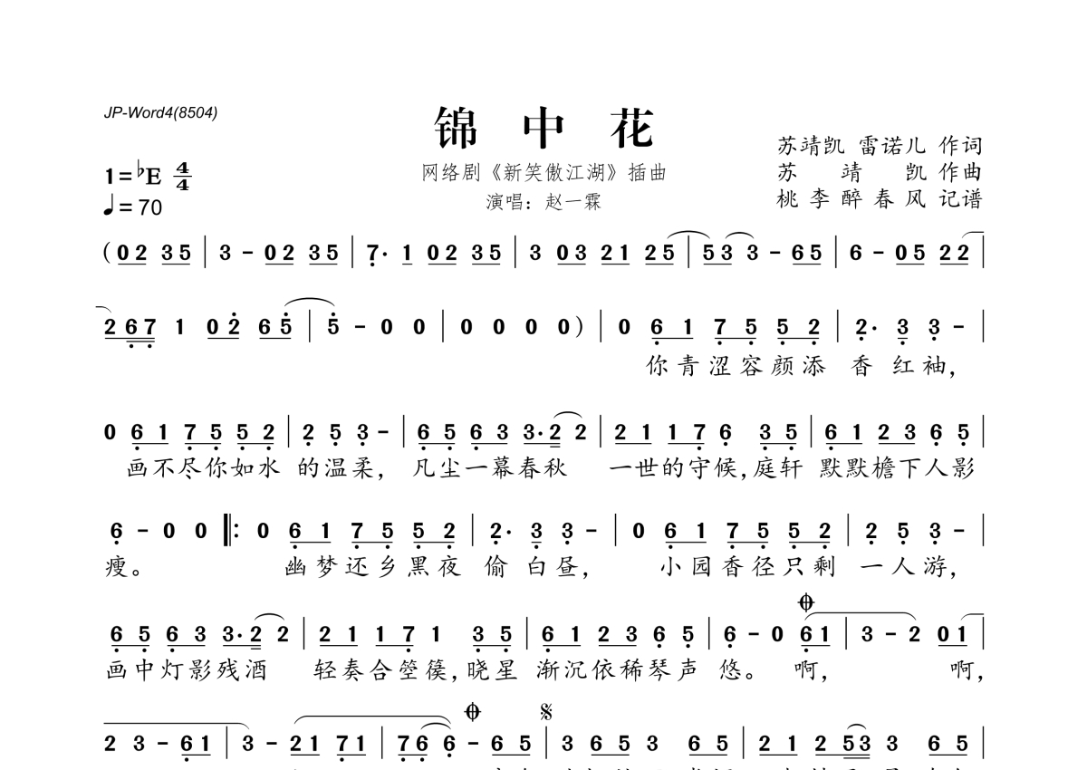 《锦中花》是赵一霖演唱的一首歌曲,拍号为4/4拍,歌曲速度为每分钟70拍,这份简谱共有一张高清图谱,图谱由 @桃李醉春风 编配上传。