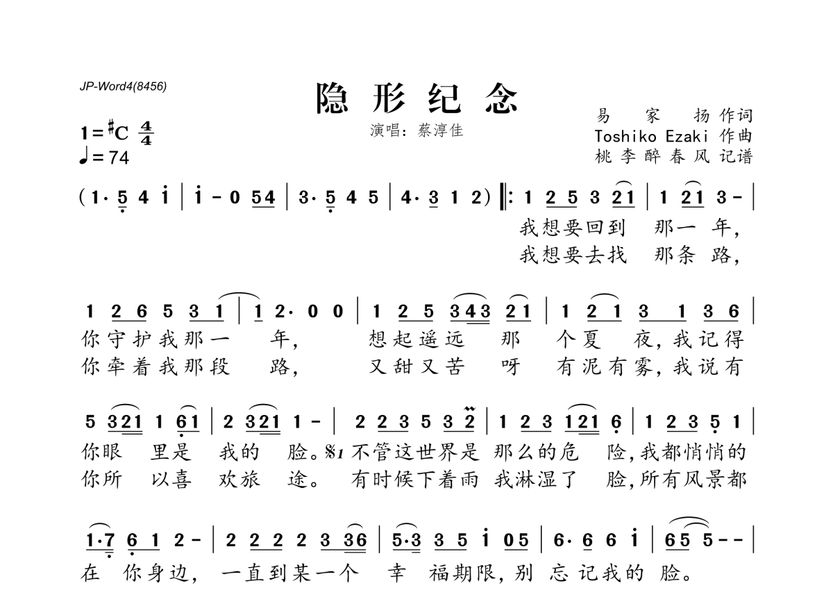 《隐形纪念》是蔡淳佳演唱的一首歌曲,拍号为4/4拍,歌曲速度为每分钟74拍,这份简谱共有一张高清图谱,图谱由 @桃李醉春风 编配上传。