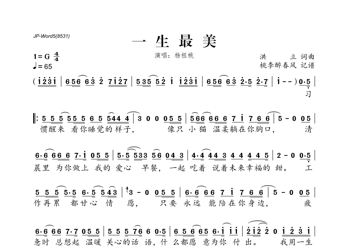 《一生最美》是杨祖桃演唱的一首歌曲,拍号为4/4拍,歌曲速度为每分钟65拍,这份简谱共有一张高清图谱,图谱由 @桃李醉春风 编配上传。