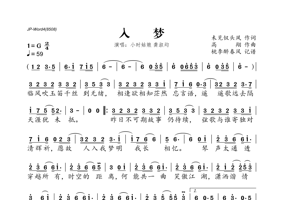 《入梦》是小时姑娘&龚淑均演唱的一首歌曲,拍号为2/4拍,歌曲速度为每分钟59拍,这份简谱共有一张高清图谱,图谱由 @桃李醉春风 编配上传。