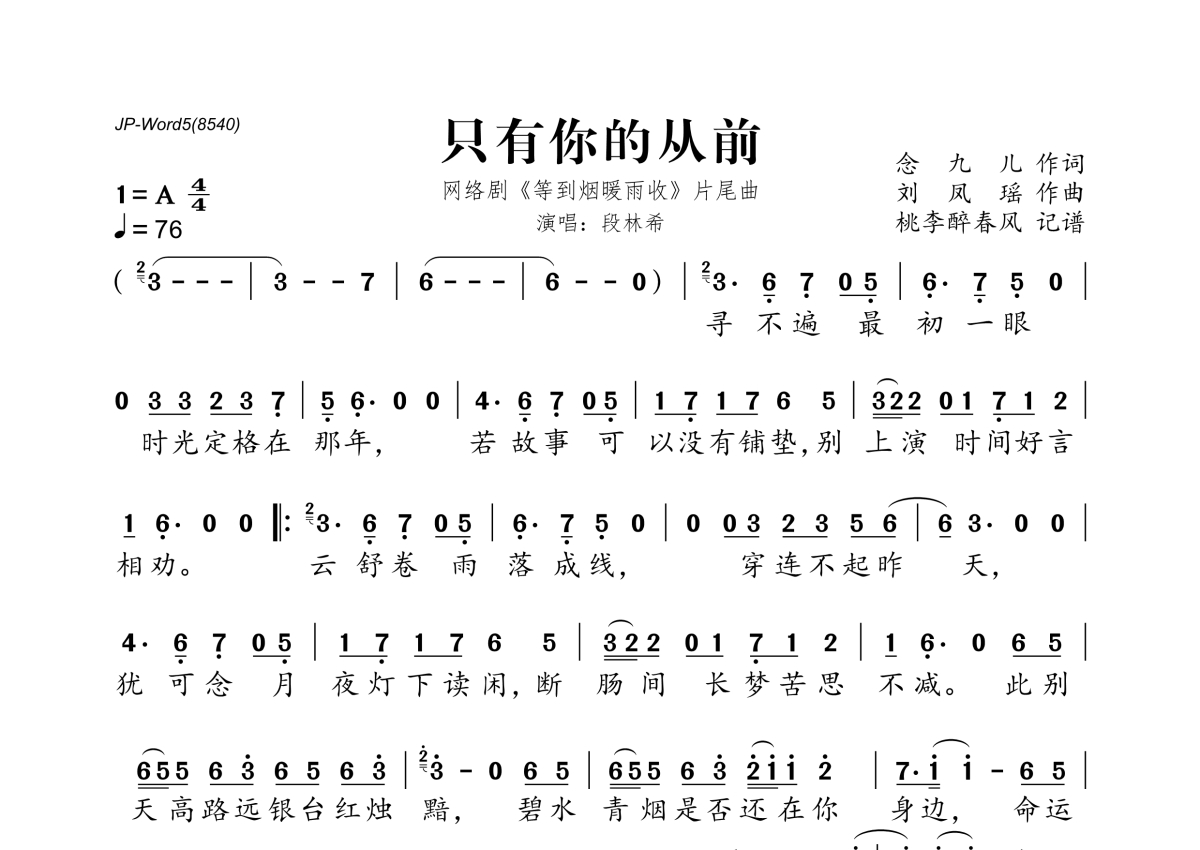 《只有你的从前》是段林希演唱的一首歌曲,拍号为4/4拍,歌曲速度为每分钟76拍,这份简谱共有一张高清图谱,图谱由 @桃李醉春风 编配上传。
