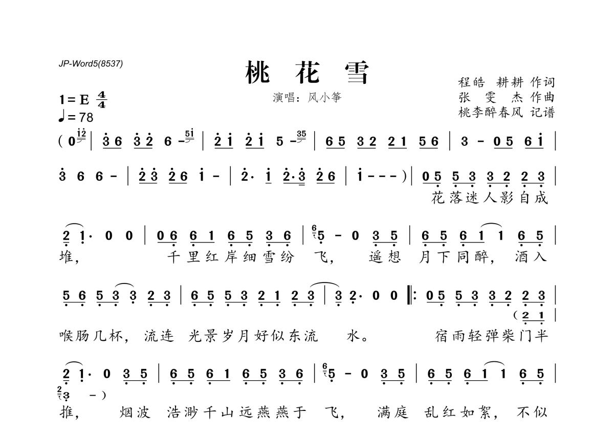 《桃花雪》是风小筝演唱的一首歌曲,拍号为4/4拍,歌曲速度为每分钟78拍,这份简谱共有一张高清图谱,图谱由 @桃李醉春风 编配上传。