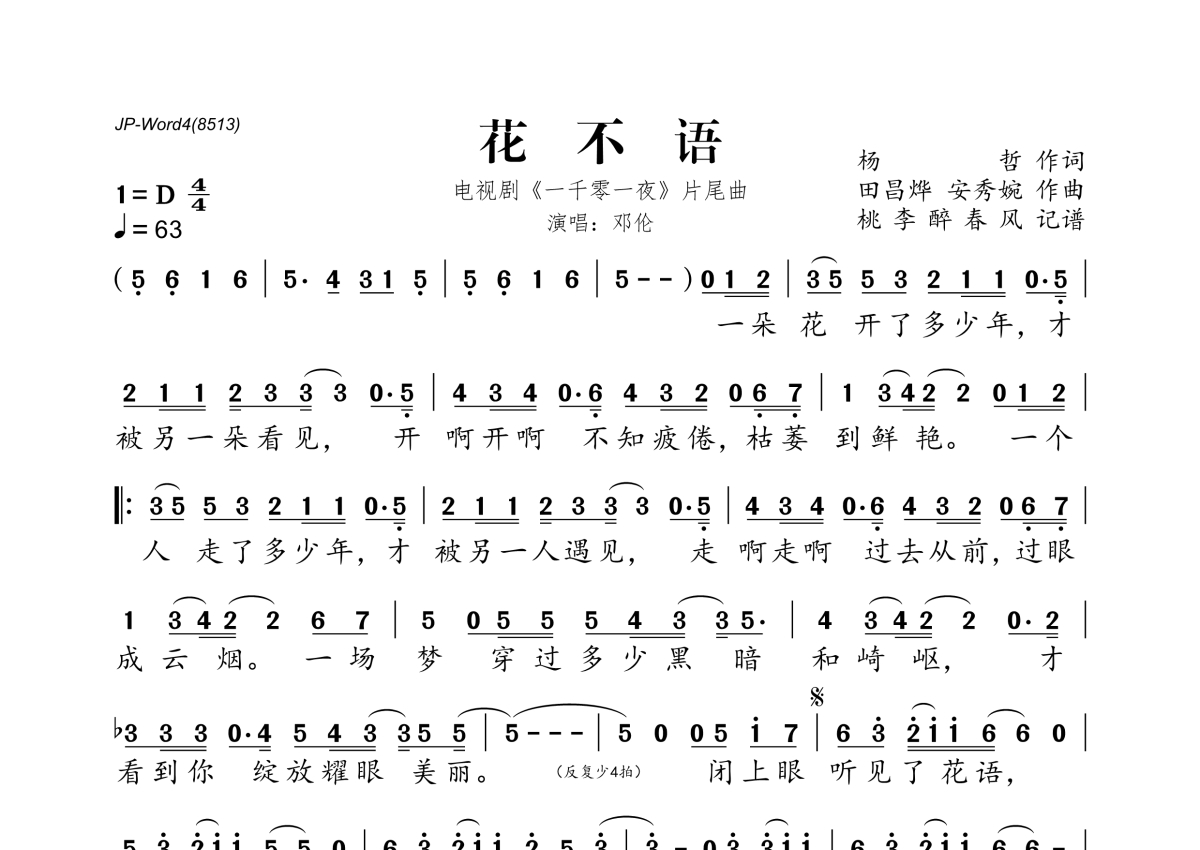 《花不语》是邓伦演唱的一首歌曲,拍号为4/4拍,歌曲速度为每分钟63拍,这份简谱共有一张高清图谱,图谱由 @桃李醉春风 编配上传。
