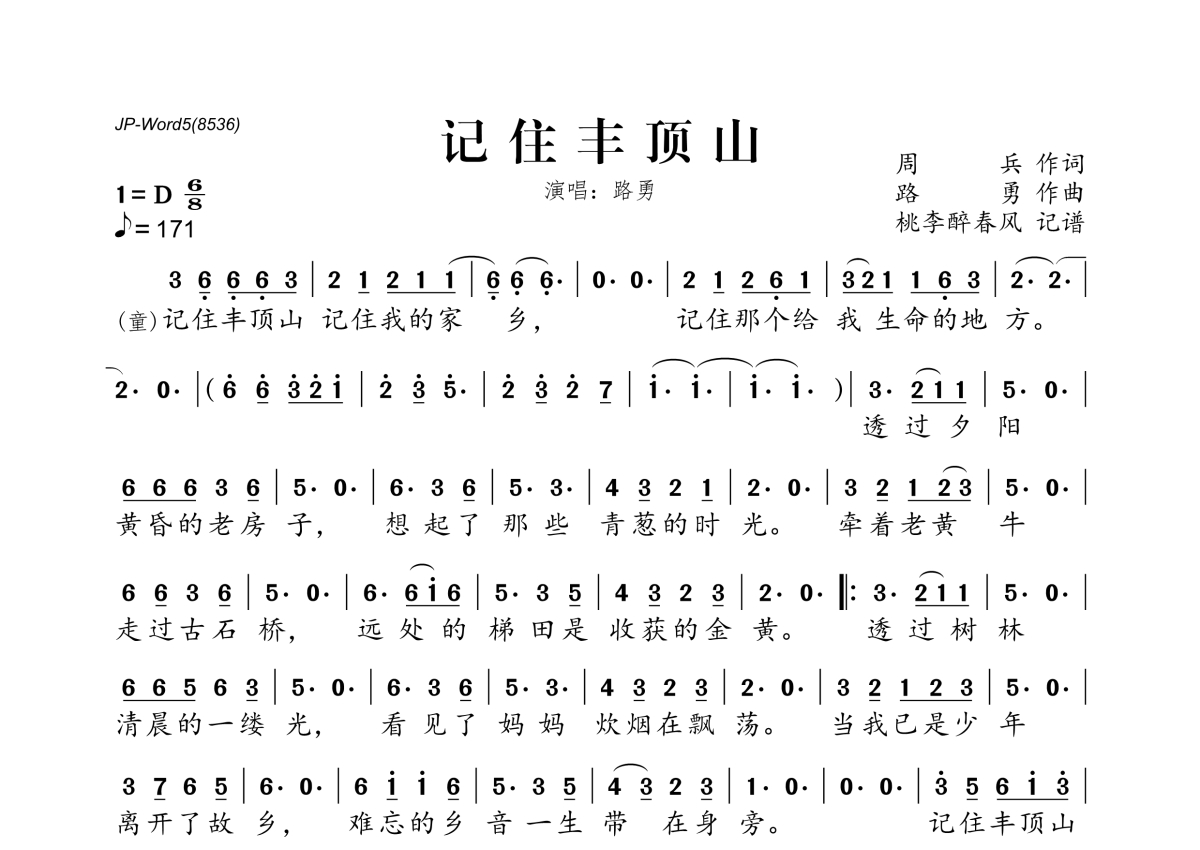 《记住丰顶山》是路勇演唱的一首歌曲,拍号为6/8拍,歌曲速度为每分钟171拍,这份简谱共有一张高清图谱,图谱由 @桃李醉春风 编配上传。