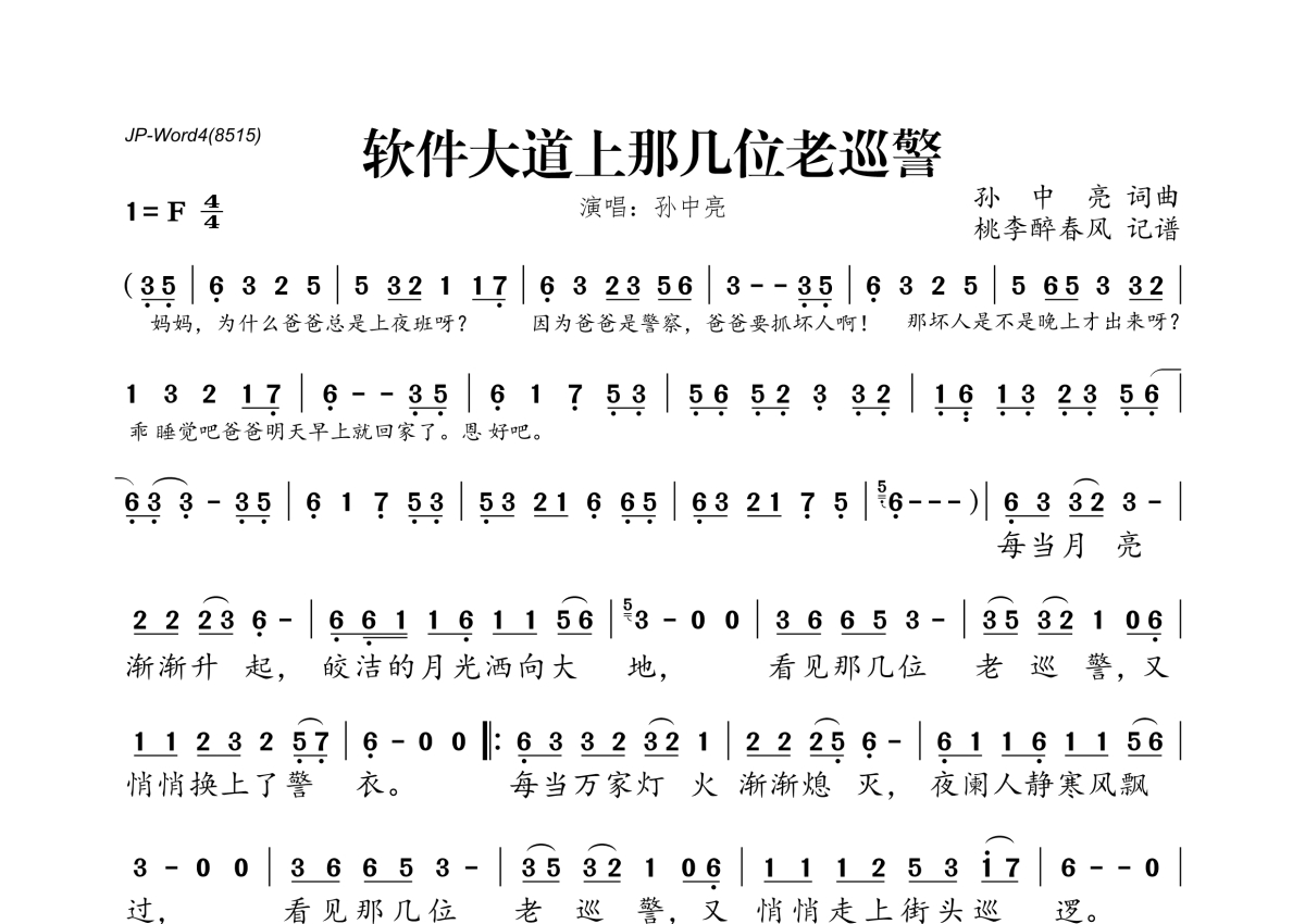 《软件大道上那几位老巡警》是孙中亮演唱的一首歌曲,拍号为4/4拍,这份简谱共有一张高清图谱,图谱由 @桃李醉春风 编配上传。