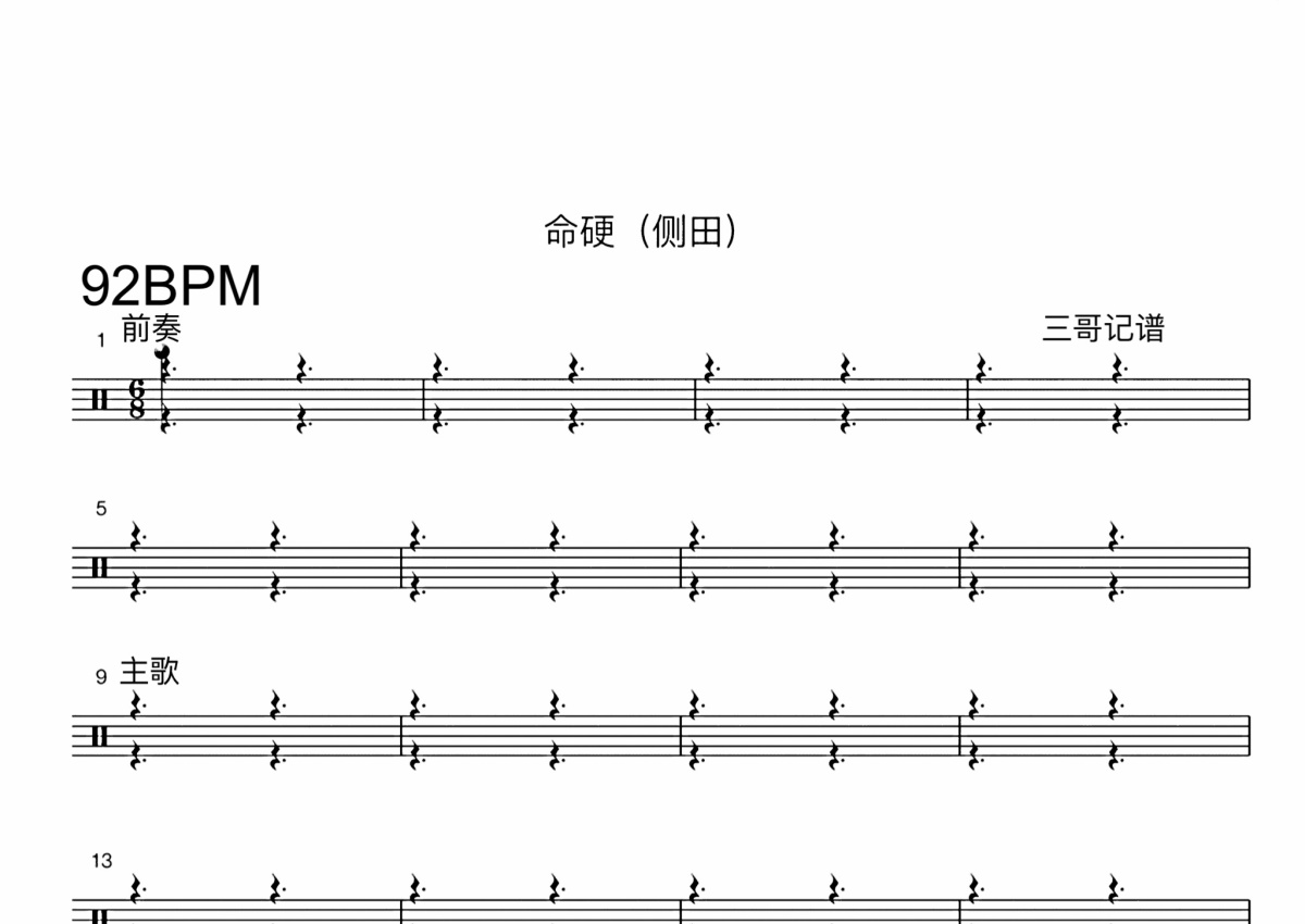 《命硬》是侧田演唱的一首歌曲,这份鼓谱共有四张高清图谱,图谱由 @打鼓谱 编配上传,图谱使用五线谱编配,使用这份命硬架子鼓谱,你将能够轻松地敲打出这首侧田的命硬,快来尝试吧。《命硬》是由黄伟文作词、侧田作曲并演唱的歌曲,收录于侧田2005年发行的音乐专辑《Justin》中 2006年,该曲入围第28届十大中文金曲奖“十大金曲奖”提名。