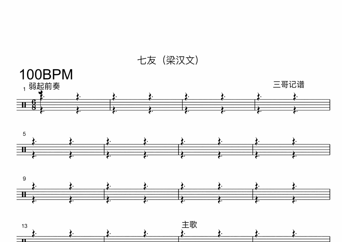 《七友》是梁汉文演唱的一首歌曲,这份鼓谱共有五张高清图谱,图谱由 @打鼓谱 编配上传,图谱使用五线谱编配,使用这份七友架子鼓谱,你将能够轻松地敲打出这首梁汉文的七友,快来尝试吧。《七友》是香港歌手梁汉文演唱的一首粤语歌曲,由林夕作词,雷颂德作曲,收录在梁汉文2003年5月16日发行的专辑《10号》。