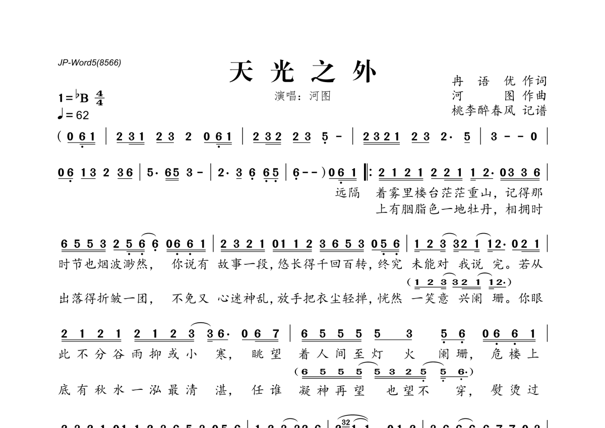 《天光之外》是河图演唱的一首歌曲,拍号为4/4拍,歌曲速度为每分钟62拍,这份简谱共有一张高清图谱,图谱由 @桃李醉春风 编配上传。