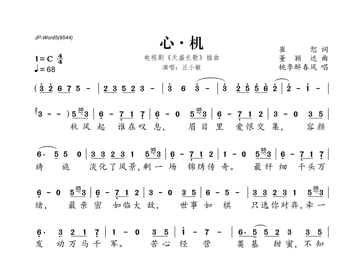 《心·机》是汪小敏演唱的一首歌曲,拍号为4/4拍,歌曲速度为每分钟68拍,这份简谱共有一张高清图谱,图谱由 @桃李醉春风 编配上传。