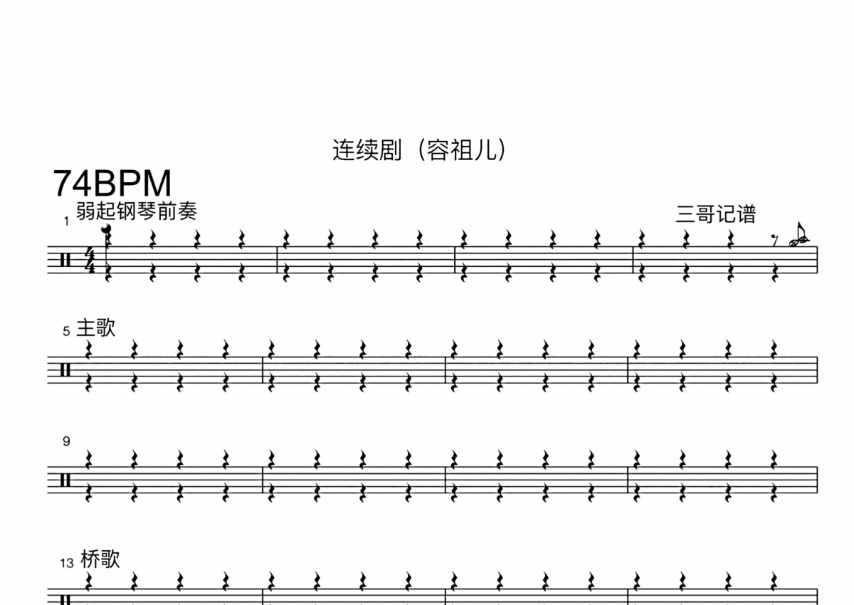 《连续剧》是容祖儿演唱的一首歌曲,这份鼓谱共有三张高清图谱,图谱由 @打鼓谱 编配上传,图谱使用五线谱编配,使用这份连续剧架子鼓谱,你将能够轻松地敲打出这首容祖儿的连续剧,快来尝试吧。《连续剧》是TVB电视剧《on call 36小时》的主题曲,由容祖儿演唱。