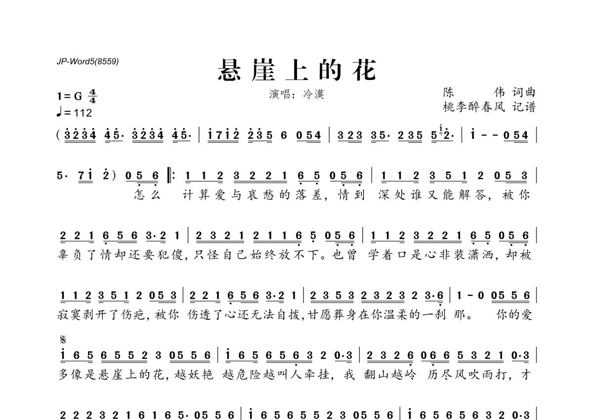 《悬崖上的花》是冷漠演唱的一首歌曲,拍号为4/4拍,歌曲速度为每分钟112拍,这份简谱共有一张高清图谱,图谱由 @桃李醉春风 编配上传。