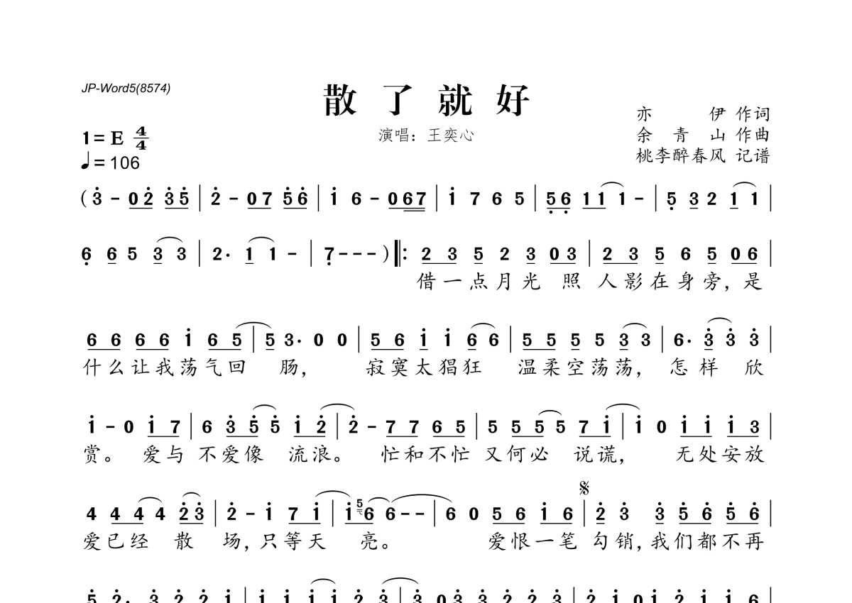 《散了就好》是王奕心演唱的一首歌曲,拍号为4/4拍,歌曲速度为每分钟106拍,这份简谱共有一张高清图谱,图谱由 @桃李醉春风 编配上传。