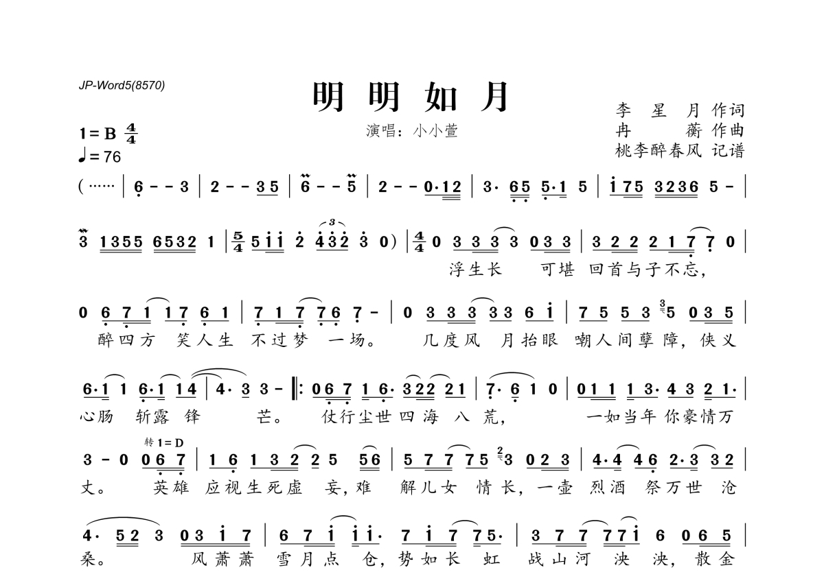 《明明如月》是小小萱演唱的一首歌曲,拍号为4/4拍,歌曲速度为每分钟76拍,这份简谱共有一张高清图谱,图谱由 @桃李醉春风 编配上传。