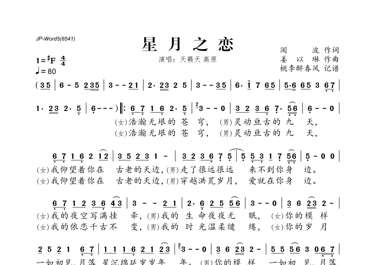 《星月之恋》是天籁天&高原演唱的一首歌曲,拍号为4/4拍,歌曲速度为每分钟80拍,这份简谱共有一张高清图谱,图谱由 @桃李醉春风 编配上传。