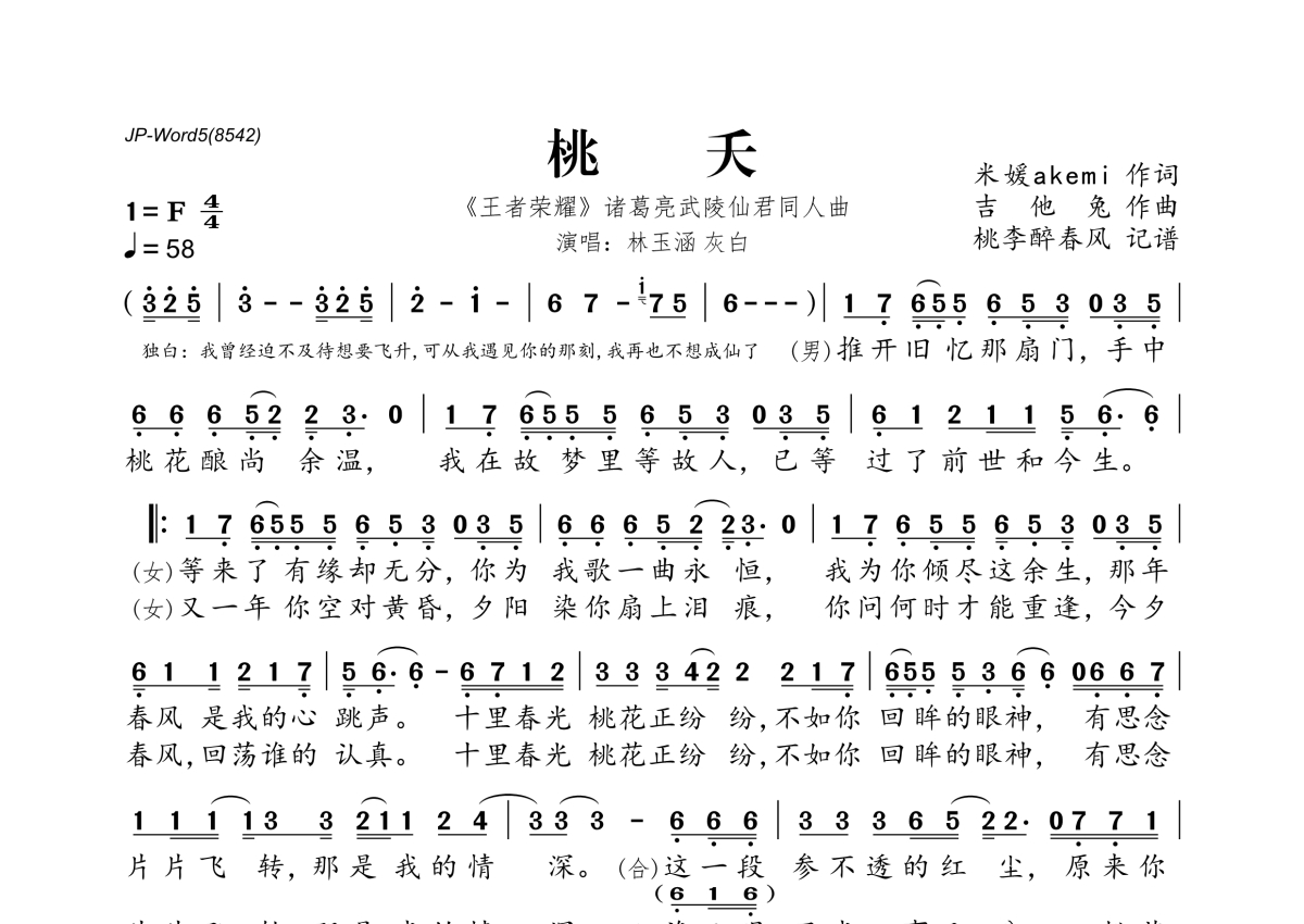 《桃夭》是林玉涵&灰白演唱的一首歌曲,拍号为4/4拍,歌曲速度为每分钟58拍,这份简谱共有一张高清图谱,图谱由 @桃李醉春风 编配上传。