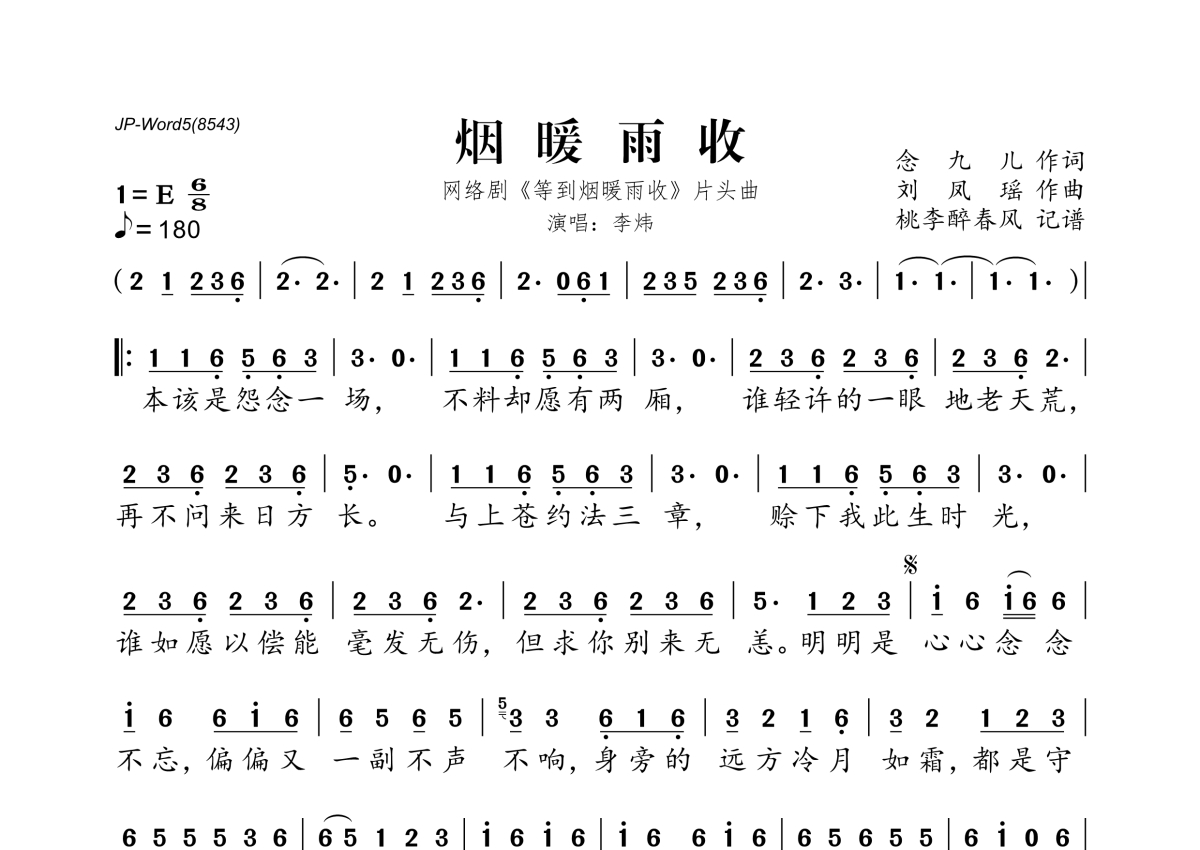 《烟暖雨收》是李炜演唱的一首歌曲,拍号为6/8拍,歌曲速度为每分钟180拍,这份简谱共有一张高清图谱,图谱由 @桃李醉春风 编配上传。