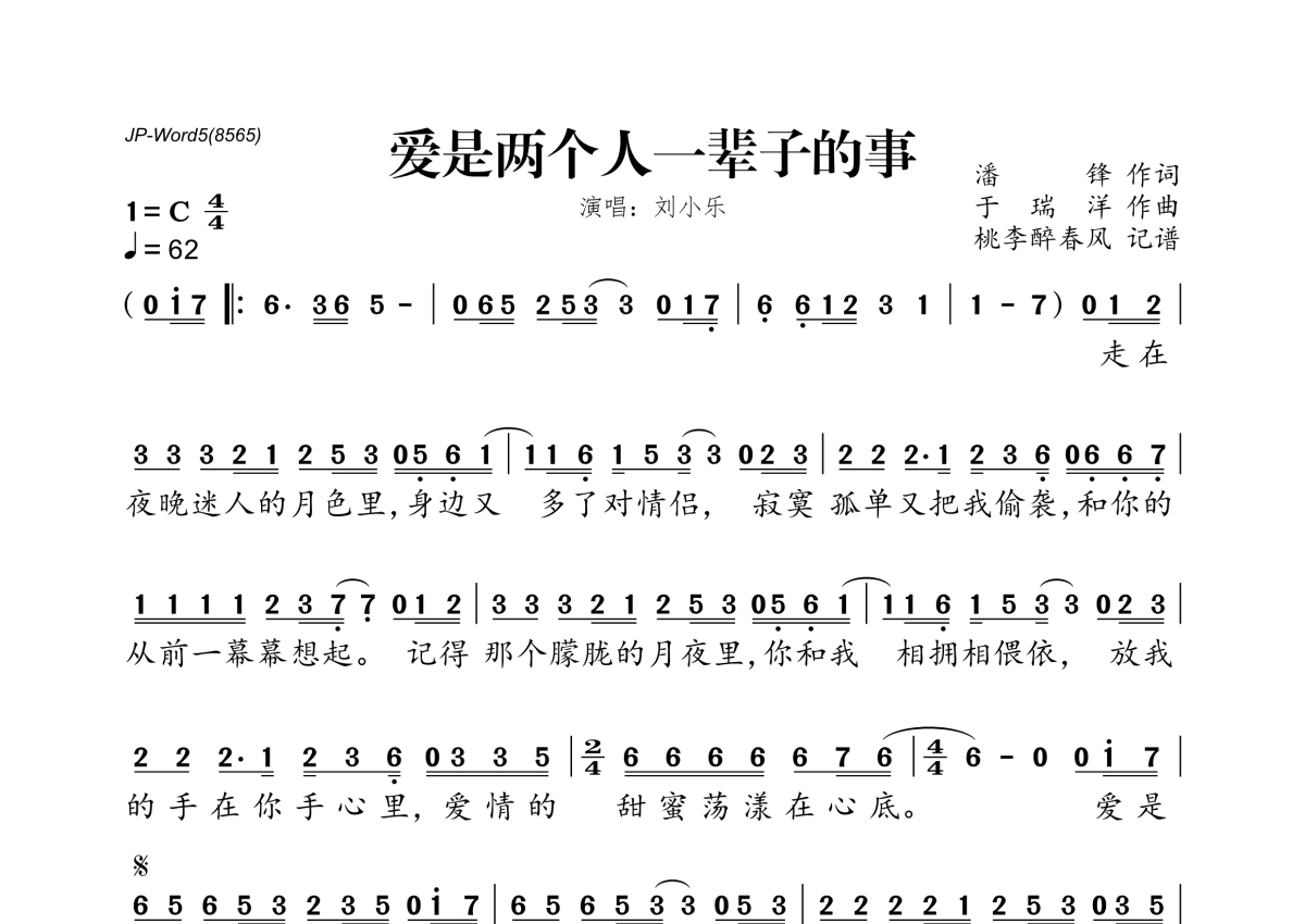 《爱是两个人一辈子的事》是刘小乐演唱的一首歌曲,拍号为4/4拍,歌曲速度为每分钟62拍,这份简谱共有一张高清图谱,图谱由 @桃李醉春风 编配上传。