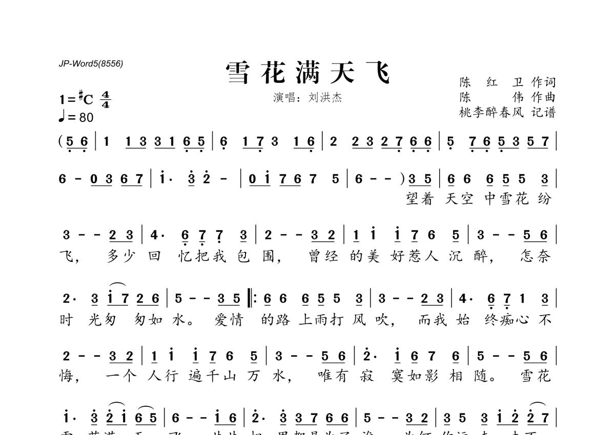 《雪花满天飞》是刘洪杰演唱的一首歌曲,拍号为4/4拍,歌曲速度为每分钟80拍,这份简谱共有一张高清图谱,图谱由 @桃李醉春风 编配上传。