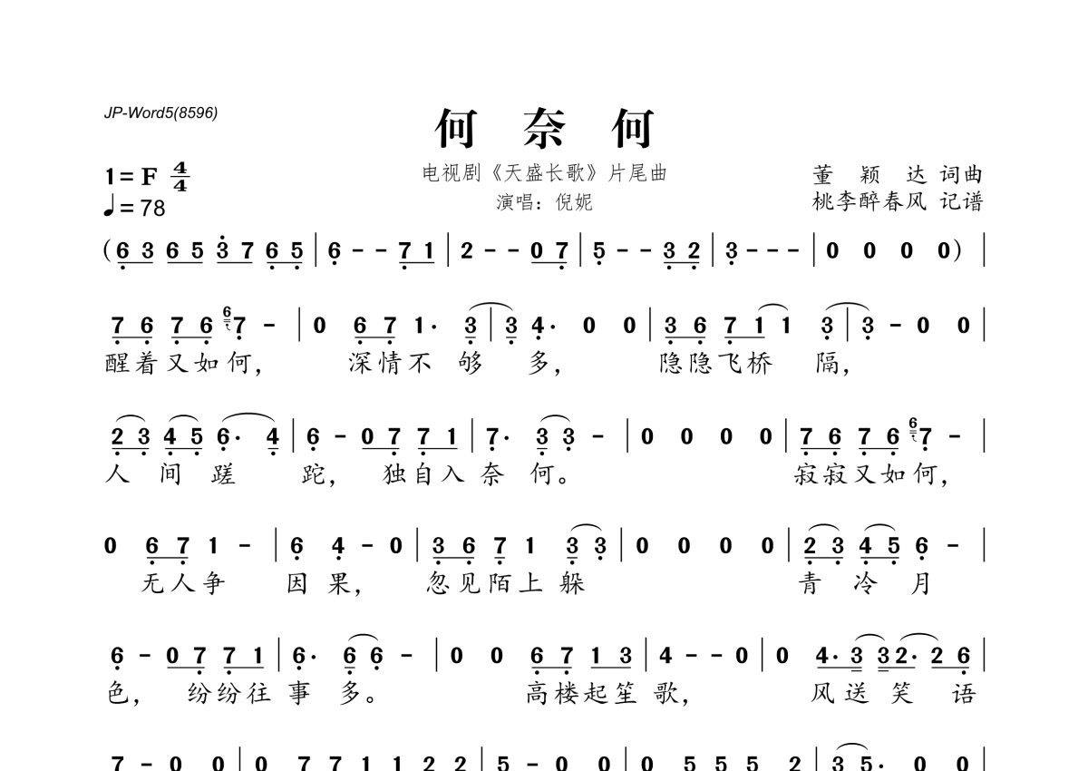 《何奈何》是倪妮演唱的一首歌曲,拍号为4/4拍,歌曲速度为每分钟78拍,这份简谱共有一张高清图谱,图谱由 @桃李醉春风 编配上传。